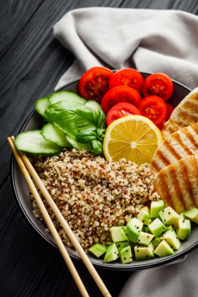 | Single Serving Size | 3/4 cup of Cooked Quinoa + 4 oz of Chicken, cooked + 1/2 vegetables |