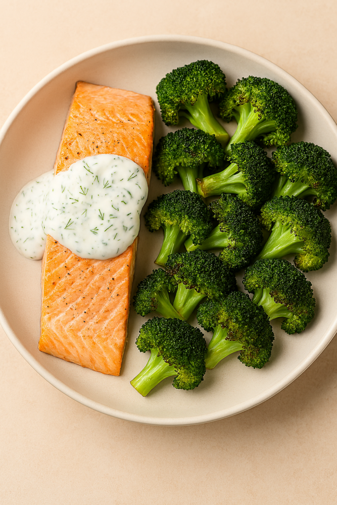 - Serve salmon with yogurt sauce and broccoli.