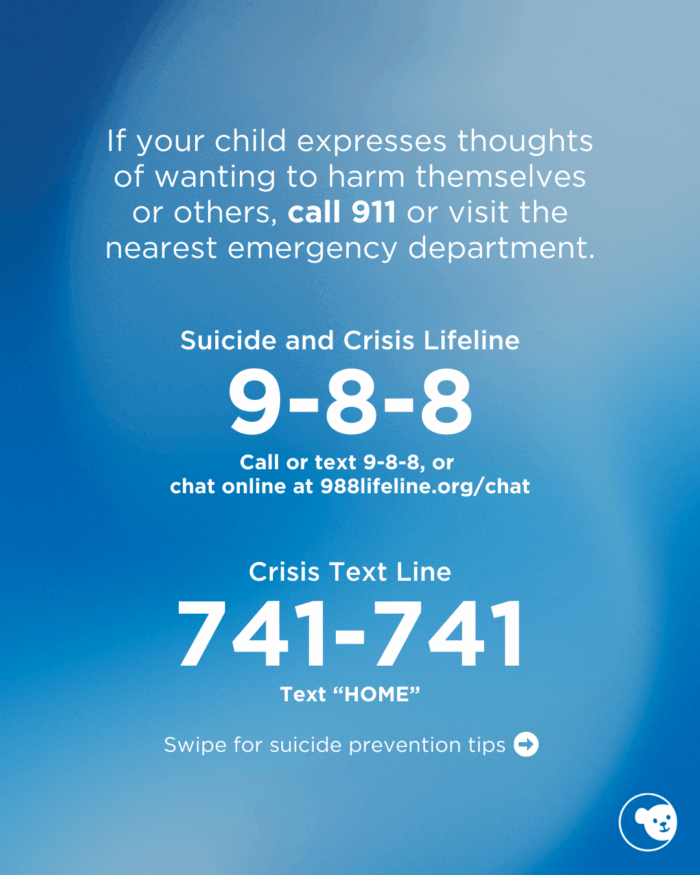 If your child expresses thoughts of wanting to harm themselves or others, call 9-1-1 or visit the nearest emergency department.